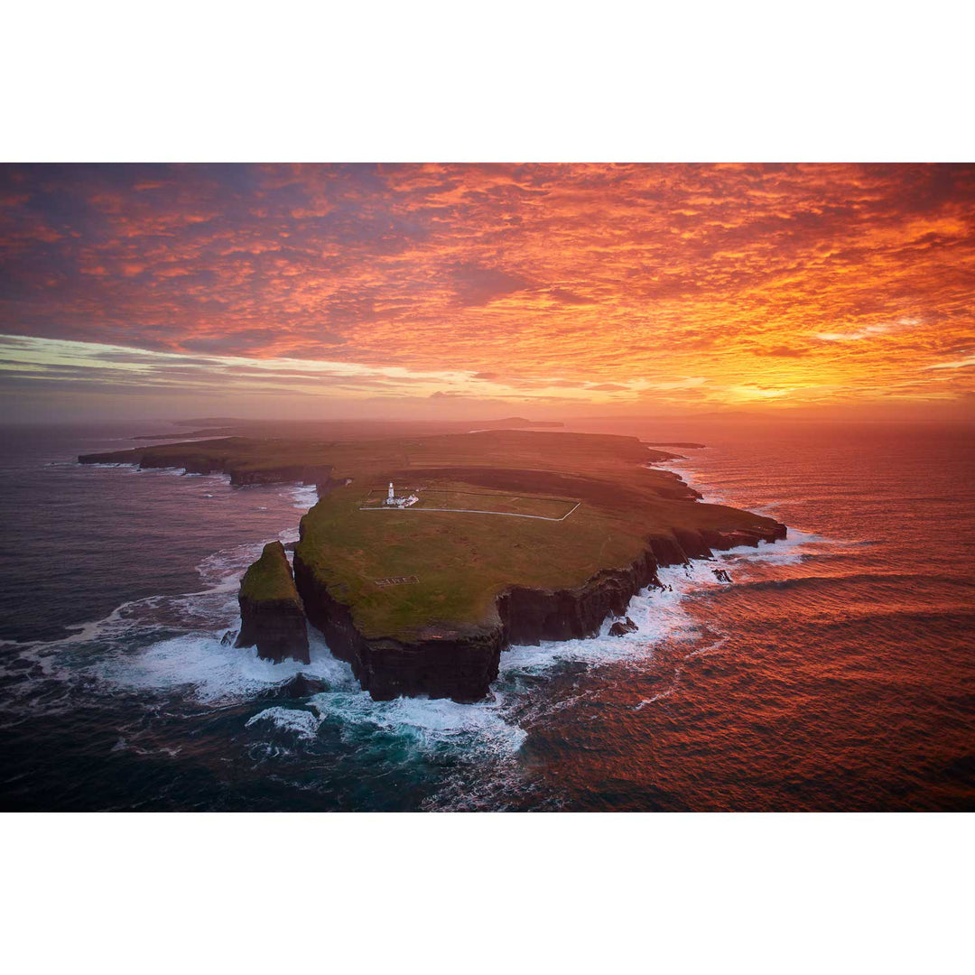 A fiery sunrise over Loop Head in Clare. This point is the culmination of the line of cliffs along the clare coast that start with the Cliffs of Moher further north. The Shannon Estuary lies to the right of the frame, and the Atlantic Ocean to the left. The "Eire" sign near the tip of the peninsula was placed there during WWII to assist US pilots ferrying aircraft across the Atlantic with their navigation.