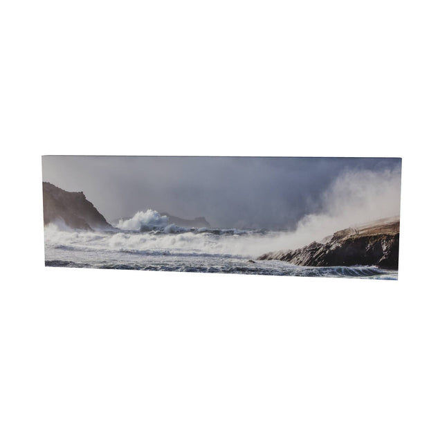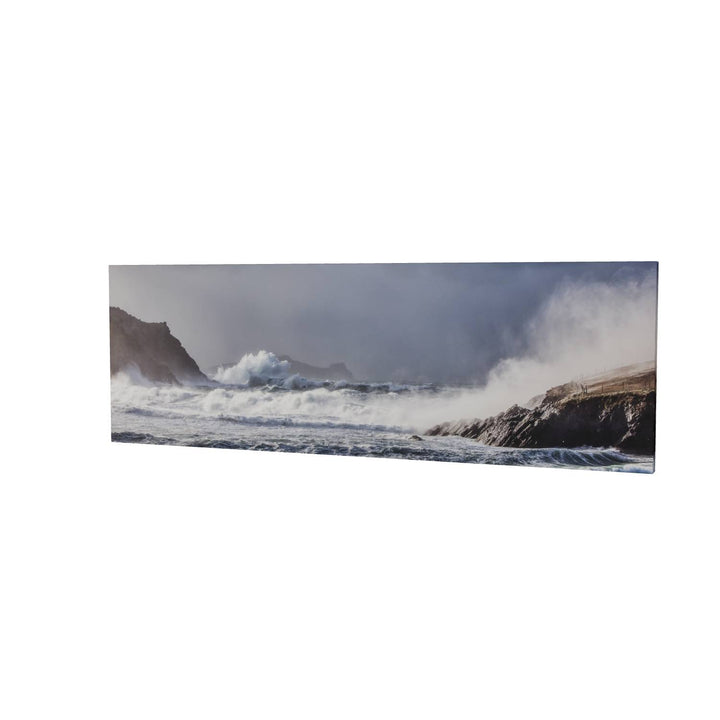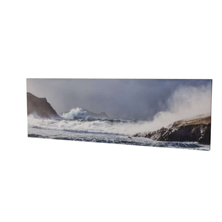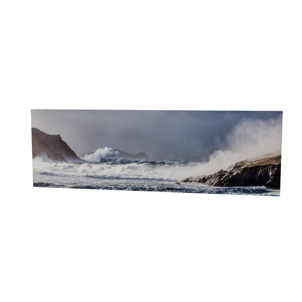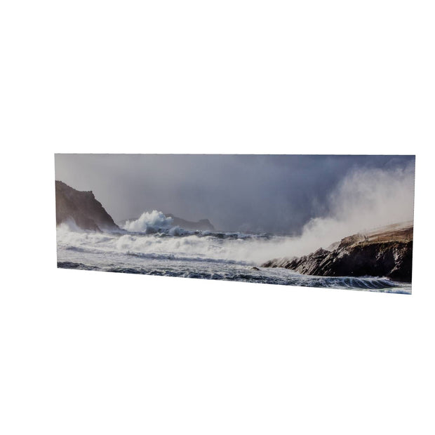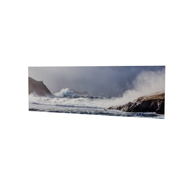 Inis Tuaisceart, the Sleeping Giant, is visible on the horizon just past the breaking wave.