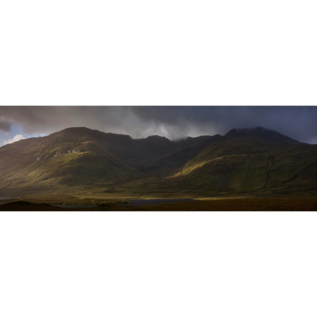 The sun grazes the side of Mweelrea in Connemara on a stormy day.