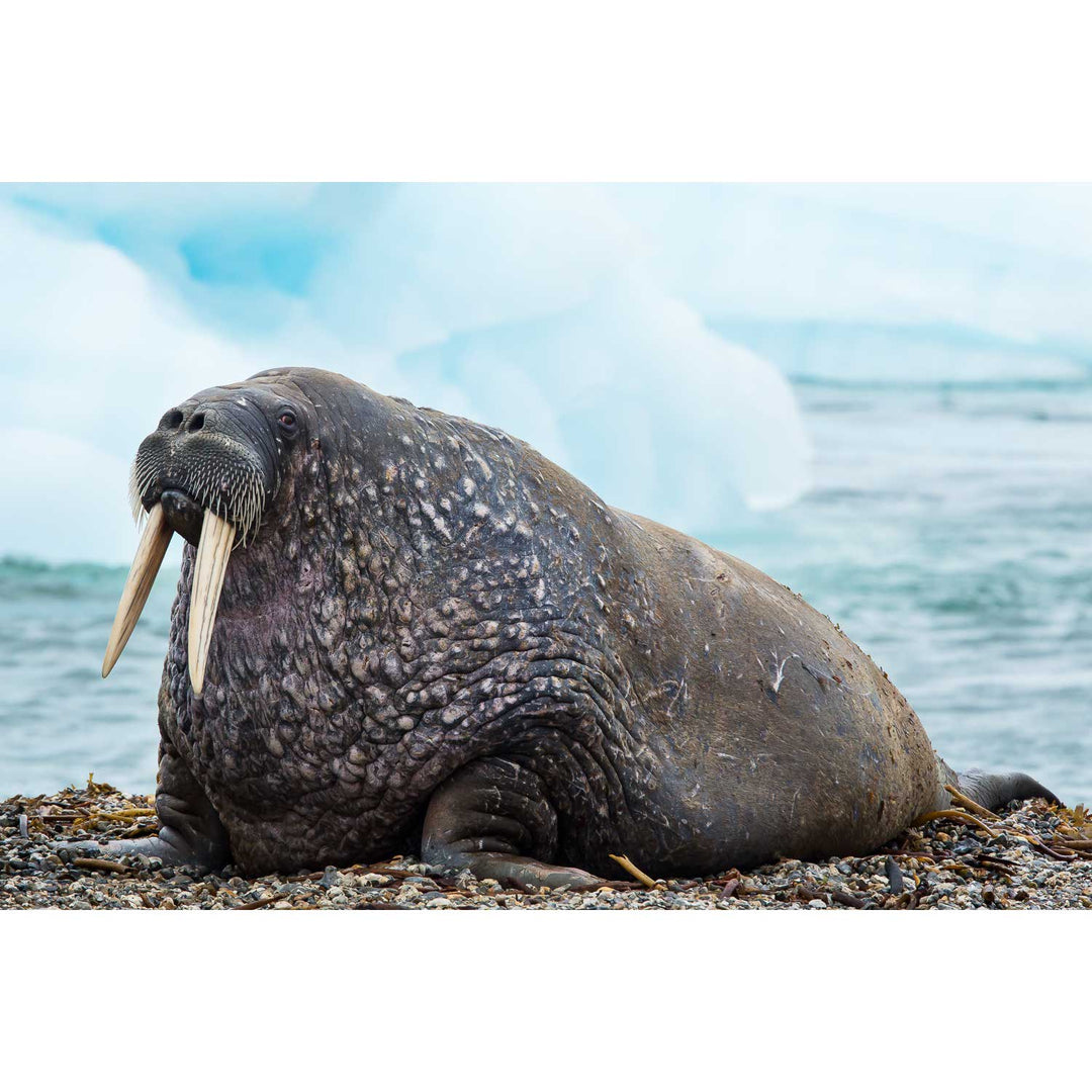 This striking photograph captures the essence of the Arctic wilderness, featuring a majestic walrus resting along the icy shores of Svalbard. The walrus's rugged texture and imposing tusks are beautifully contrasted against the softly blurred backdrop of ice and sea, bringing a serene yet powerful presence to the image. Imagine this scene gracing your wall, inviting a sense of adventure and the untamed beauty of the Arctic into your space.