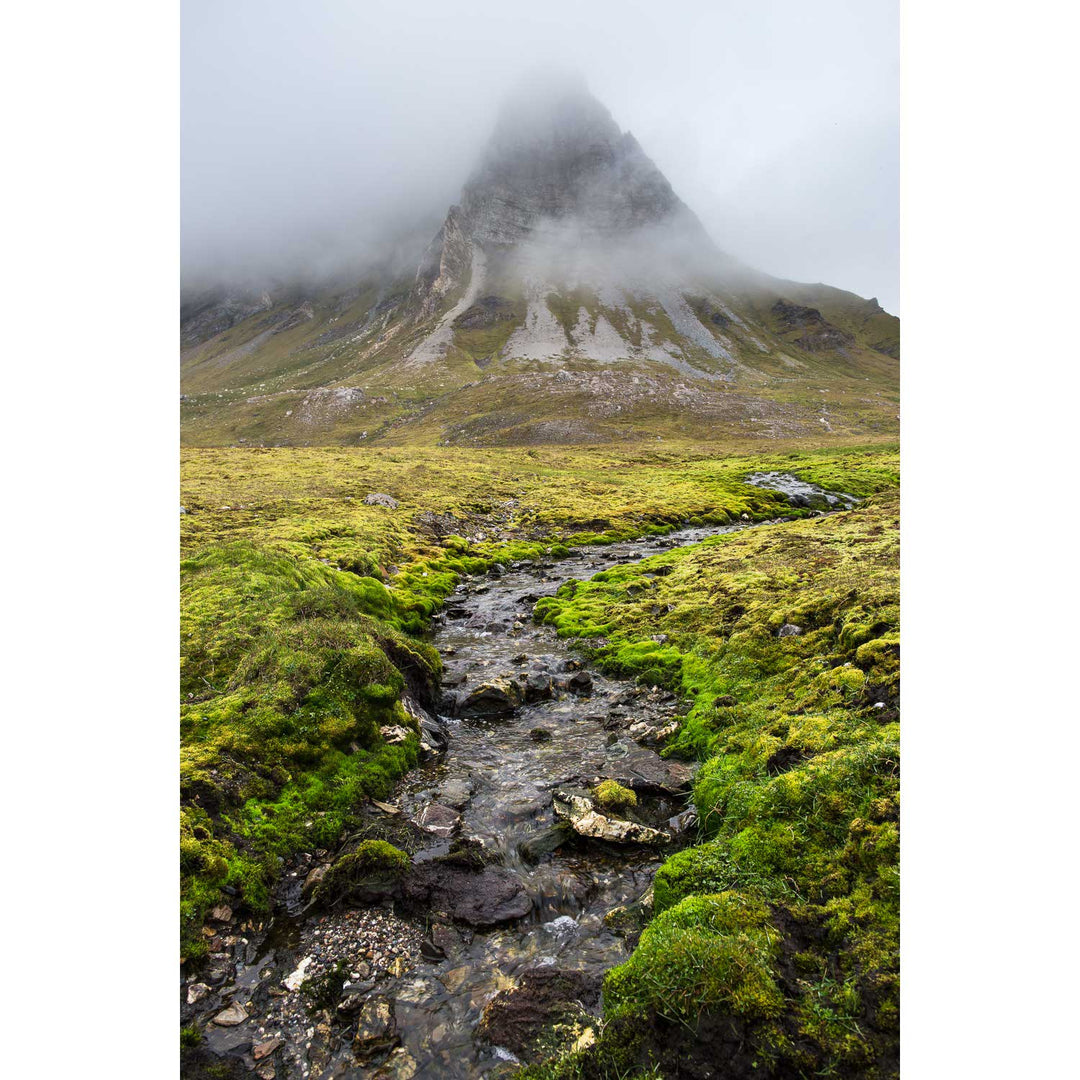 In this striking photograph of Alkhornet, the mountain stands shrouded in mist, its peak disappearing into the clouds. The gentle stream in the foreground, bordered by vibrant green moss, leads the eye towards the formidable rocky slopes. The contrast between the lush terrain and the towering, misty heights creates a serene and inviting atmosphere. Imagine this print on your wall, inviting a moment of quiet reflection and connection with nature.