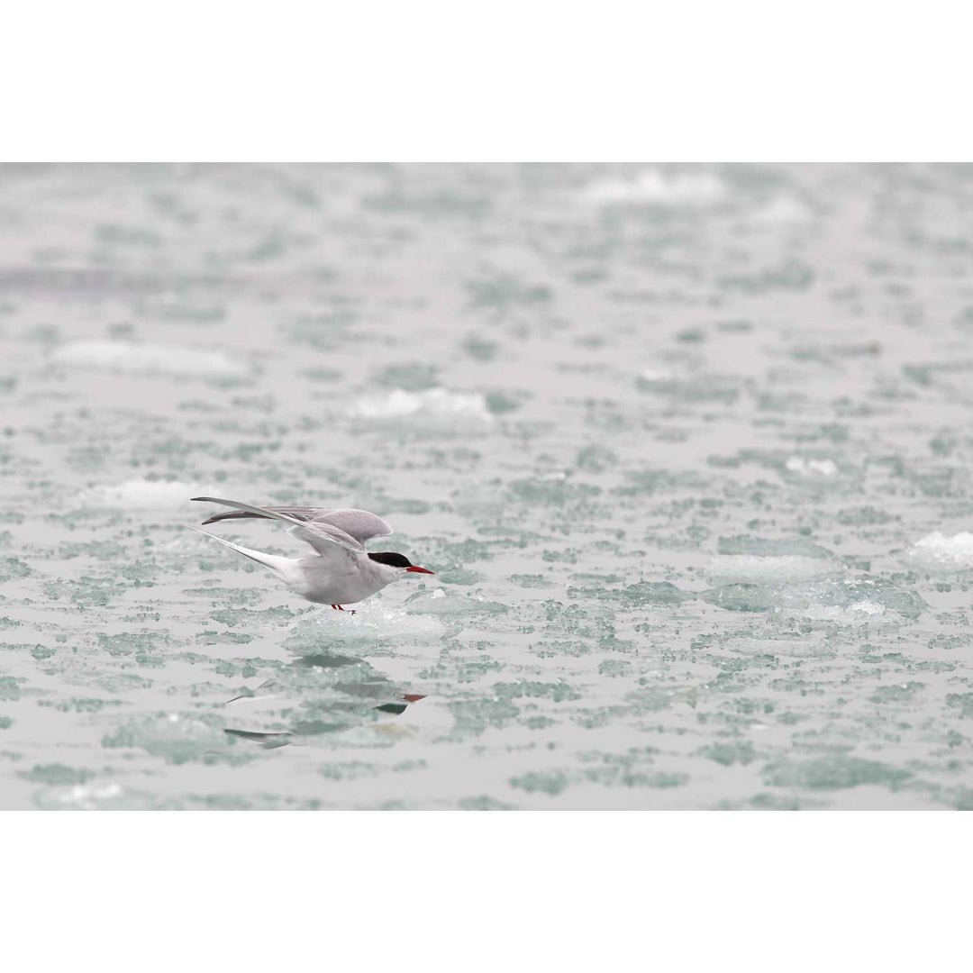 This scene captures the elegance of an Arctic Tern poised on a small chunk of ice in Svalbard. The delicate interplay of the bird's streamlined form and the scattered ice creates a sense of calm and simplicity, highlighting the pristine Arctic environment. The muted colors of the ice and water further emphasize the tern's vivid markings, drawing the eye towards its poised readiness for flight.
