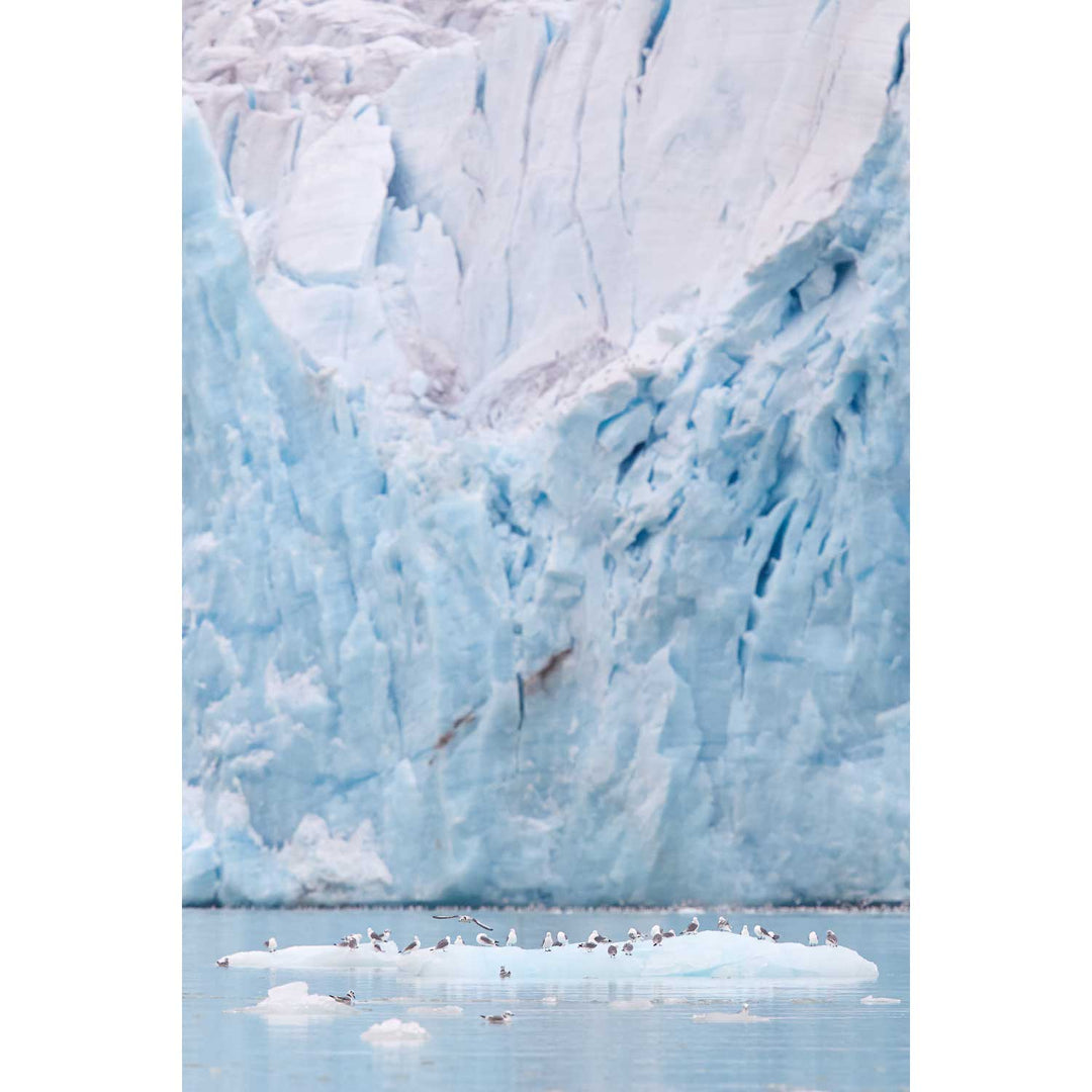 The photograph presents a fascinating scene where a cluster of kittiwakes rest on a solitary ice floe, dwarfed by the towering glacier in the background. The subtle hues of blue and white create a serene atmosphere, with the sharp edges of the ice contrasting with the smooth water beneath. Imagine this evocative scene as a print, bringing a touch of the Arctic's serene beauty to your wall.