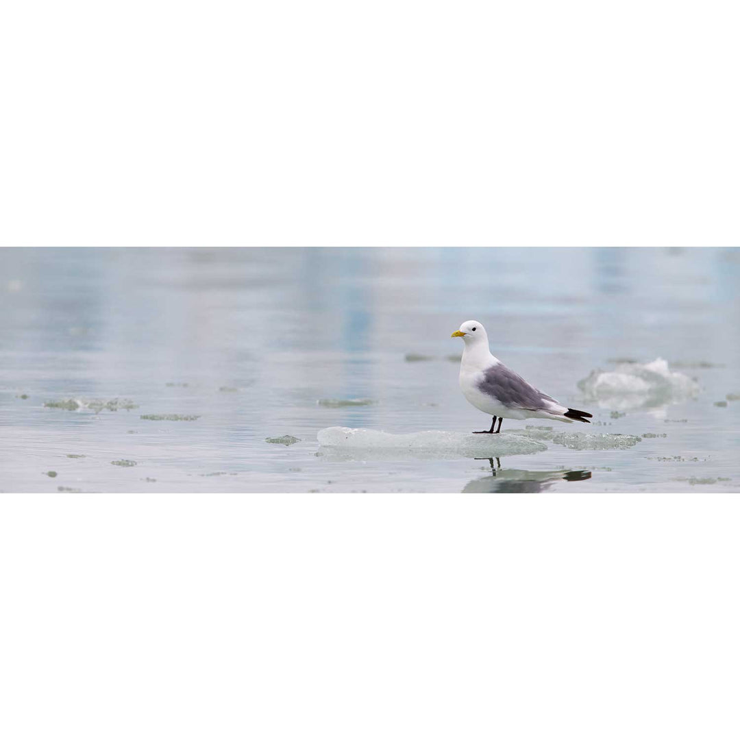 A kittiwake perches delicately on a lone piece of brash ice in the serene waters of Svalbard. The subtle palette of whites and blues creates a tranquil scene, with the bird's silhouette perfectly mirrored in the icy surface. This moment captures a sense of quiet elegance, inviting you to imagine the soothing presence of this print in your space.