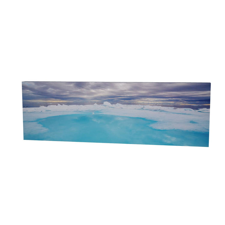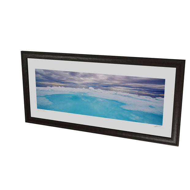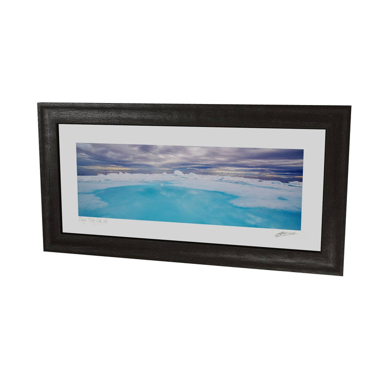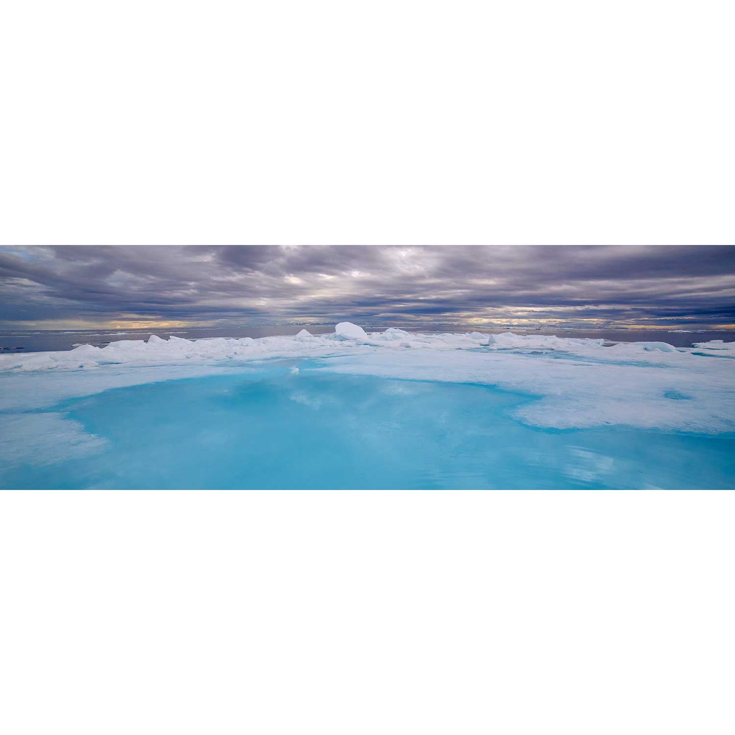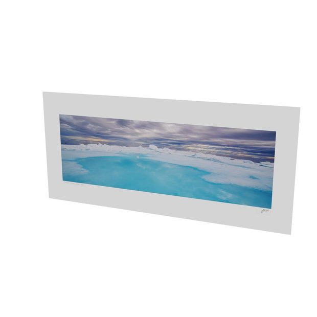 The striking contrast of sapphire-blue meltwater against the stark white ice floe is captivating. The subtle play of light and shadows on the ice creates a serene yet dynamic scene, complemented by a moody Arctic sky. This image evokes a sense of tranquil isolation, inviting viewers to pause and reflect. Imagine this print’s calming presence on your wall, bringing a touch of the Arctic's majesty into your home.