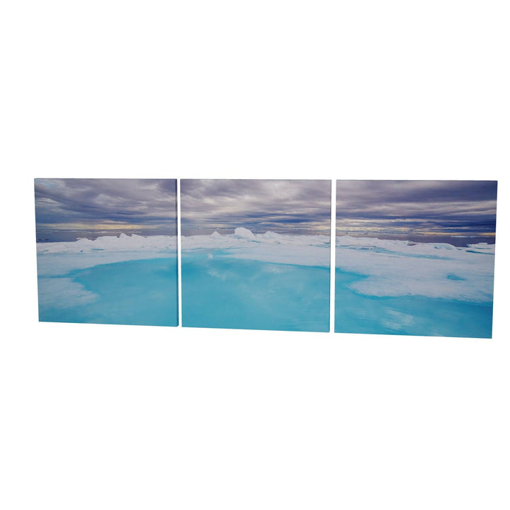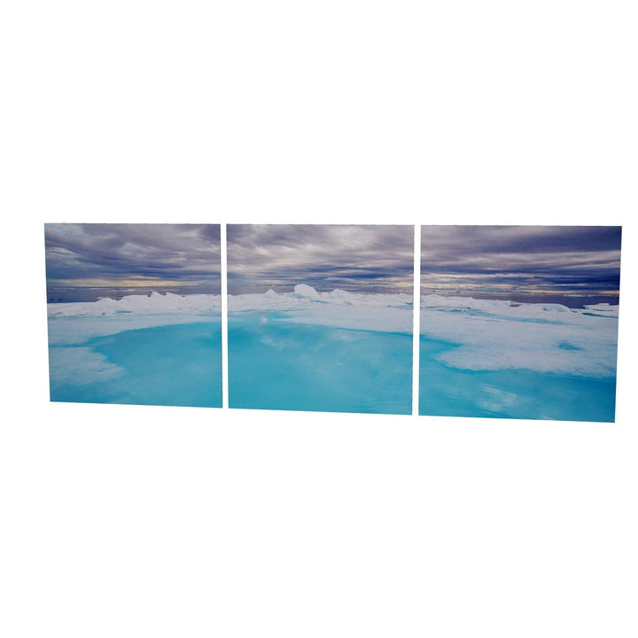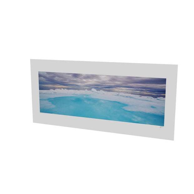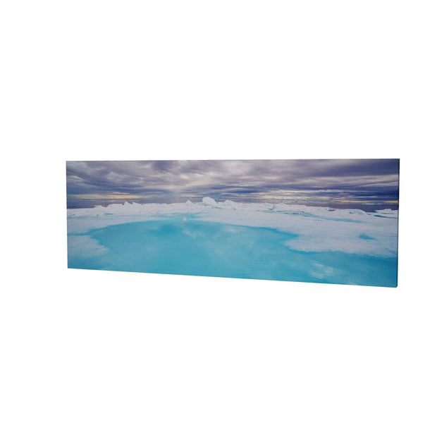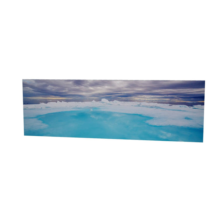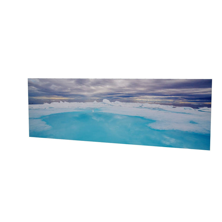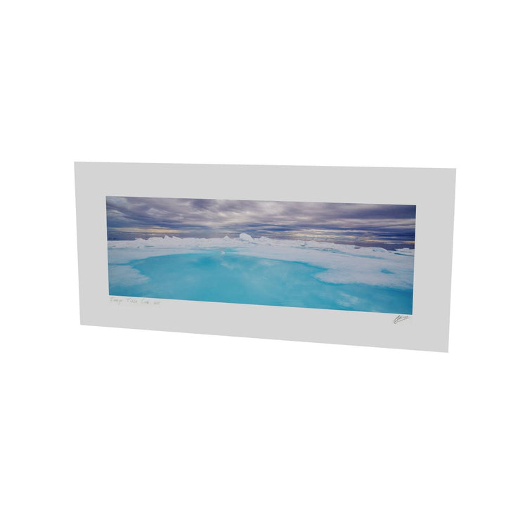The striking contrast of sapphire-blue meltwater against the stark white ice floe is captivating. The subtle play of light and shadows on the ice creates a serene yet dynamic scene, complemented by a moody Arctic sky. This image evokes a sense of tranquil isolation, inviting viewers to pause and reflect. Imagine this print’s calming presence on your wall, bringing a touch of the Arctic's majesty into your home.
