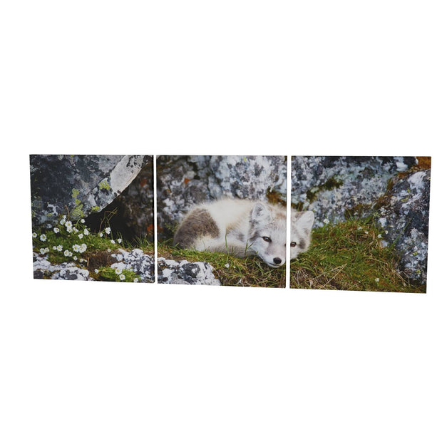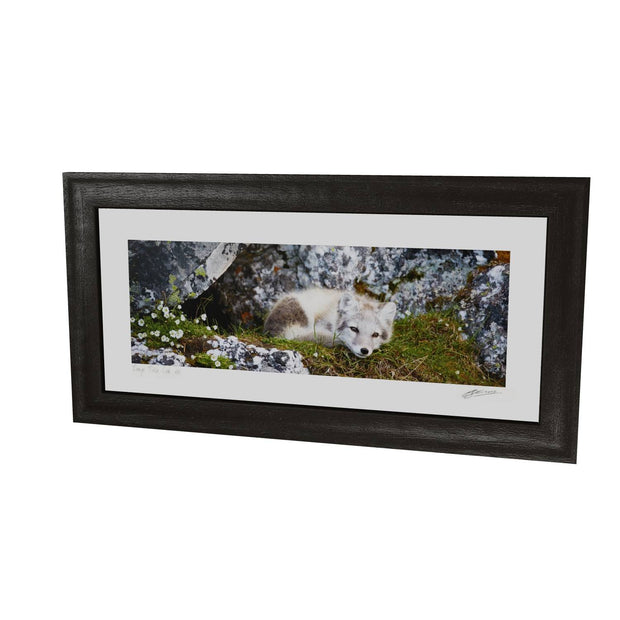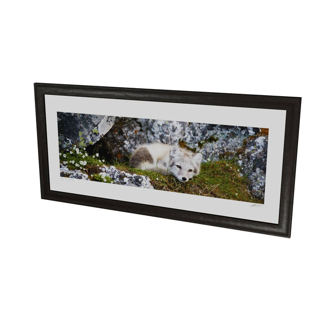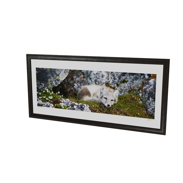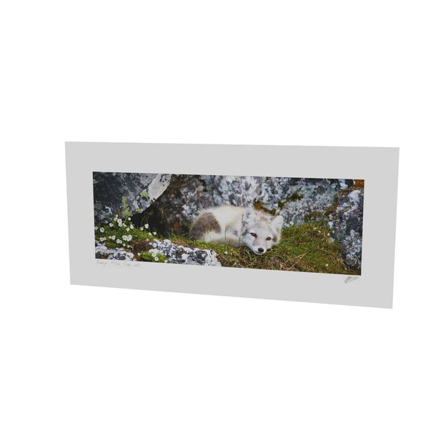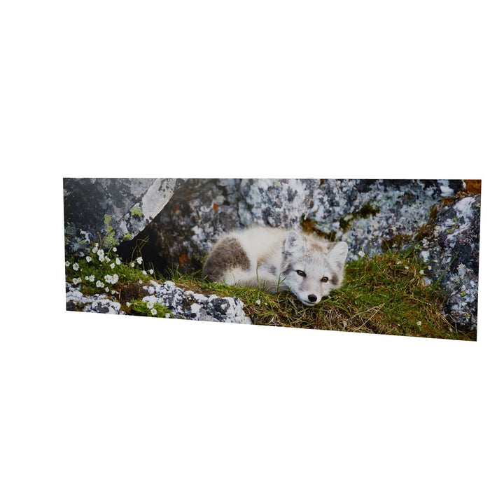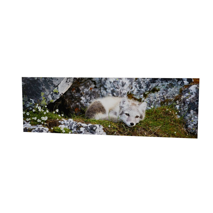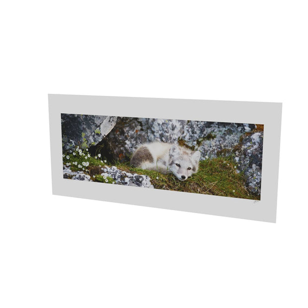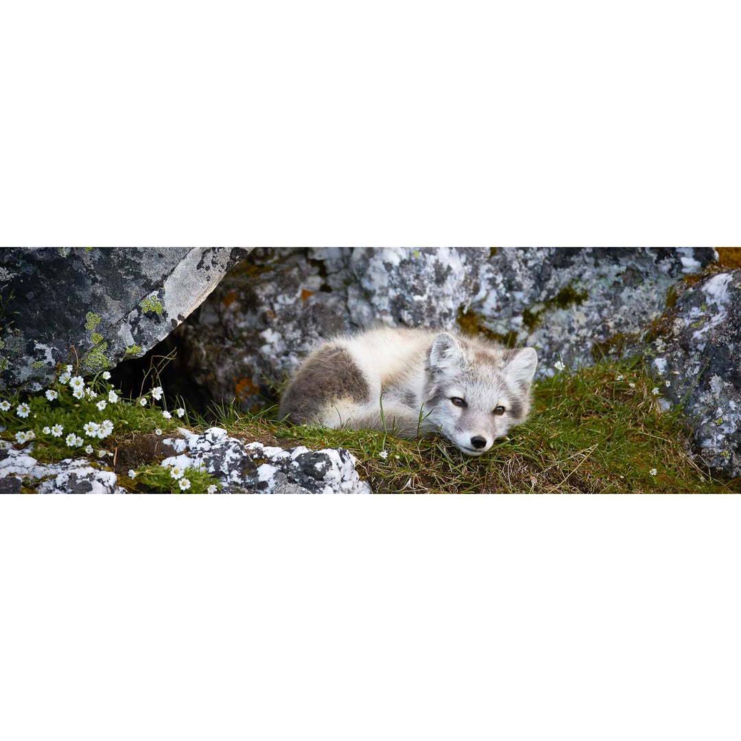Nestled in a cleft of ancient rocks, an arctic fox cub finds a serene moment of rest. The cub's soft fur contrasts with the rugged textures of the rock, and delicate flowers add a touch of color to the scene. This photograph captures the innocence and tranquility of this young creature in its natural habitat.