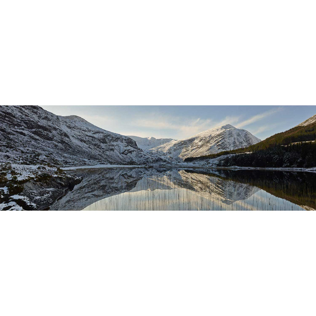 This captivating photograph captures the tranquil beauty of a snow-kissed landscape, where the serene waters of the lough perfectly mirror the surrounding mountains. The gentle light of the setting creates an atmosphere of calm, inviting you to lose yourself in its peaceful embrace. Imagine this exquisite scene adorning your wall, offering a window to nature’s untouched beauty.